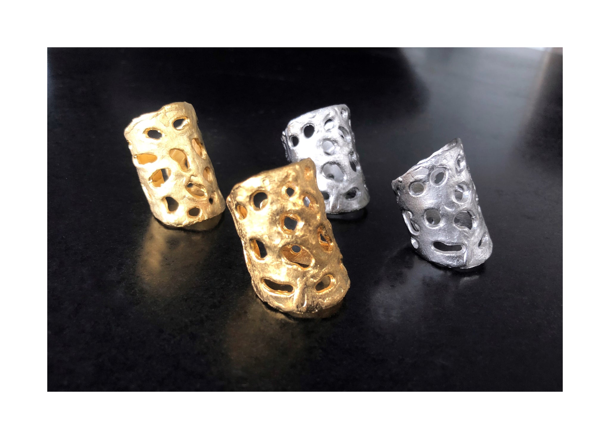 Realizado en bronce o alpaca, con baño de oro mate 24k y plata mate respectivamente.